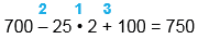 1) 25 • 2 = 50 2) 700 - 50 = 650 3) 650 + 100 = 750 |